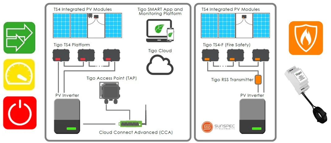 Tigo has multiple TS4 System Architectures for Rapid Shutdown that comply with the USA’s National Electric Code (NEC) 2017 specifications. The first includes rapid shutdown with monitoring and the associated functionalities of TS4-S (Safety), TS4-O (Optimization), and (TS4-L) Long Strings. The second architecture includes rapid shutdown with power-line communication and no monitoring with TS4-F (Fire Safety). This hazard control solution is applicable for any system, anywhere, for better asset management and safety compliance.